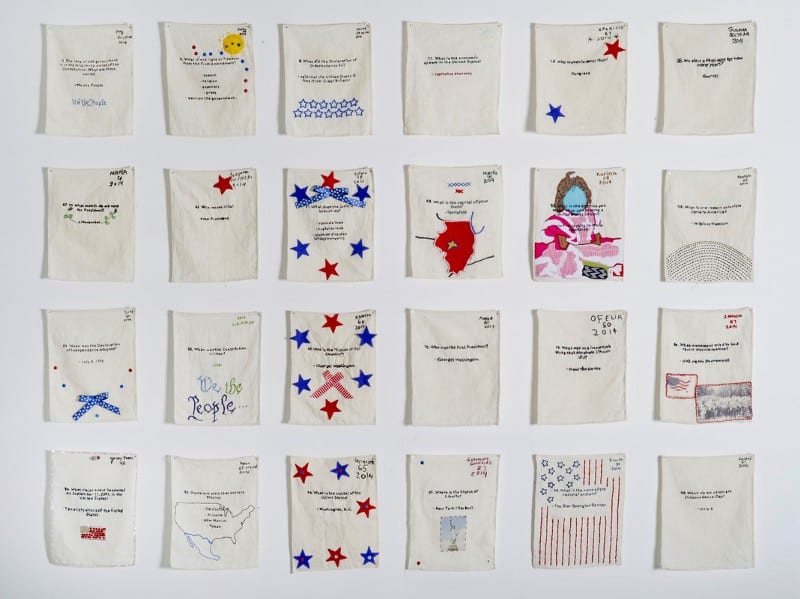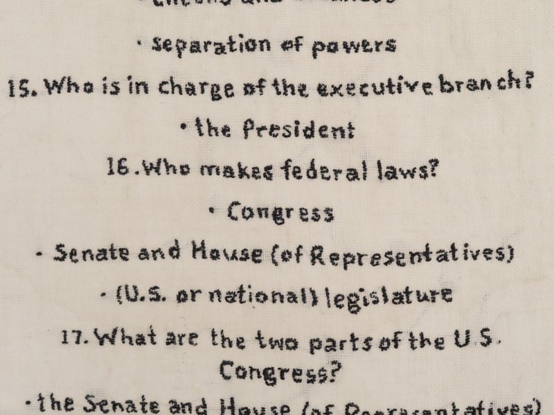 In my work today, I’m trying to complicate and deepen people’s understanding of the immigrant experience. So with my U.S. Citizenship Sampler project I’m sewing the questions from the citizenship test. I’m highlighting just how hard the test is and how discriminatory that language is against immigrants. That we have to learn these really stupid questions that citizens would never need to know. Like who was president during World War I? Why is that that going to make me a good citizen if I know that?
