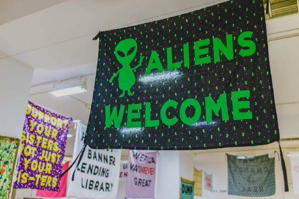 Why it’s a library is because I wanted to create a space for people who don’t feel comfortable going to protests. I think that maybe I’m a bit more fearful because it’s right in front of my face and I’m aware of people getting deported, legal residents getting deported for very minor issues all of the time. Even for being arrested at protests. So I have fears around that and of course being a new mom, I don’t feel comfortable going to protests and taking my daughter, because you never know what’s going to happen. So that’s why it ended up turning into a library. That way, the banners could still be used. We don’t have to stay silent. We can still participate in this way.