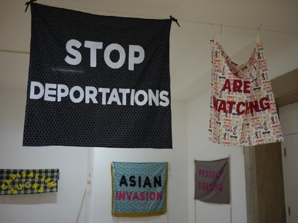 I’m still a non-citizen. I was going to wait to finish my sampler to apply for citizenship, but I freaked out after Trump. Especially making political work, I just want to be more confrontational and not fear the consequences. And I have my daughter to worry about, my “anchor baby.” So with that, I freaked out. I knew that this one person was interested in buying it, so I asked them if they would buy it without it being complete. And they were like yeah.