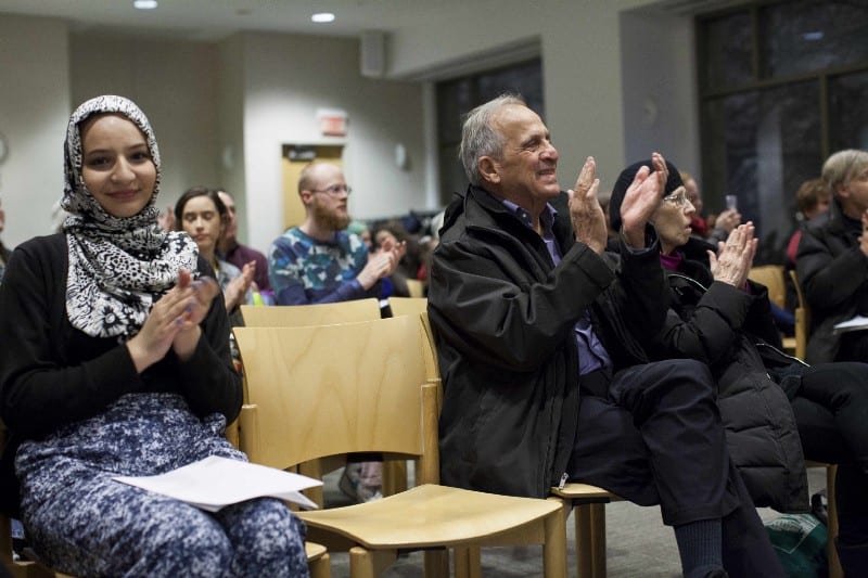 Forty people braved a snowstorm on Monday, February 5, to attend Borderless’ night of immigrant stories at the Oak Park Public Library. We teamed up with the Chicago chapter of Veterans for American Ideals to help produce the event and received support from ICNA Relief, the Syrian Community Network, and StoryCorps. The amazing Don Hall — former host of The Moth in Chicago — served as the night’s MC.