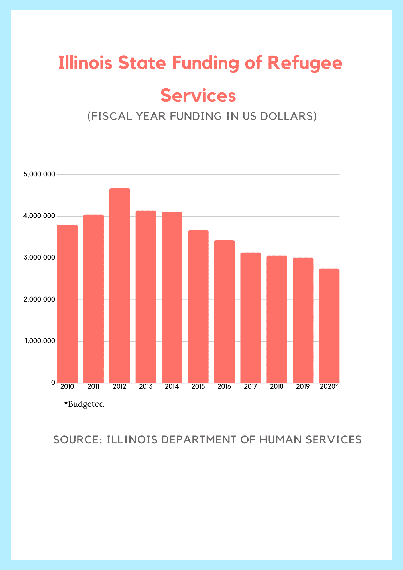 Refugee admissions to Illinois have dipped from 3,045 refugees coming here in the 2017 state fiscal year to just 885 refugees coming here in the 2019 state fiscal year — a 70 percent drop. Funding for refugees at the state level has also seen a dramatic decrease. While Illinois spent $4.6 million on refugee services in the 2012 state fiscal year, the state is budgeted to spend only $2.7 million on refugee services for the 2020 state fiscal year, which began this July.