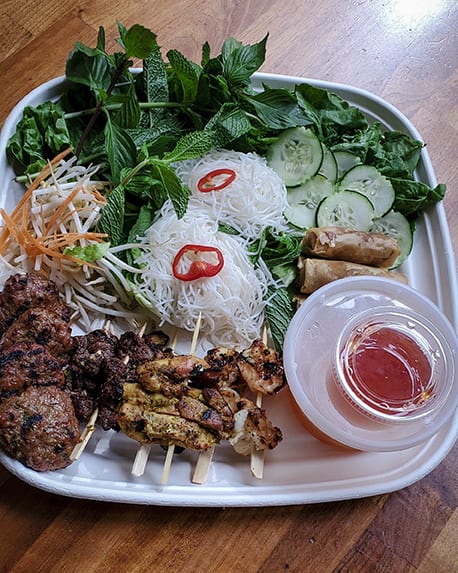 For one package Reda chose one of her cuisine’s signature items: messob, which is a platter of small dishes that include meat, fish and vegetables along with injera. Meanwhile, Saigon Sisters offers a Vietnamese deluxe salad with vegetable egg rolls and rice noodles.