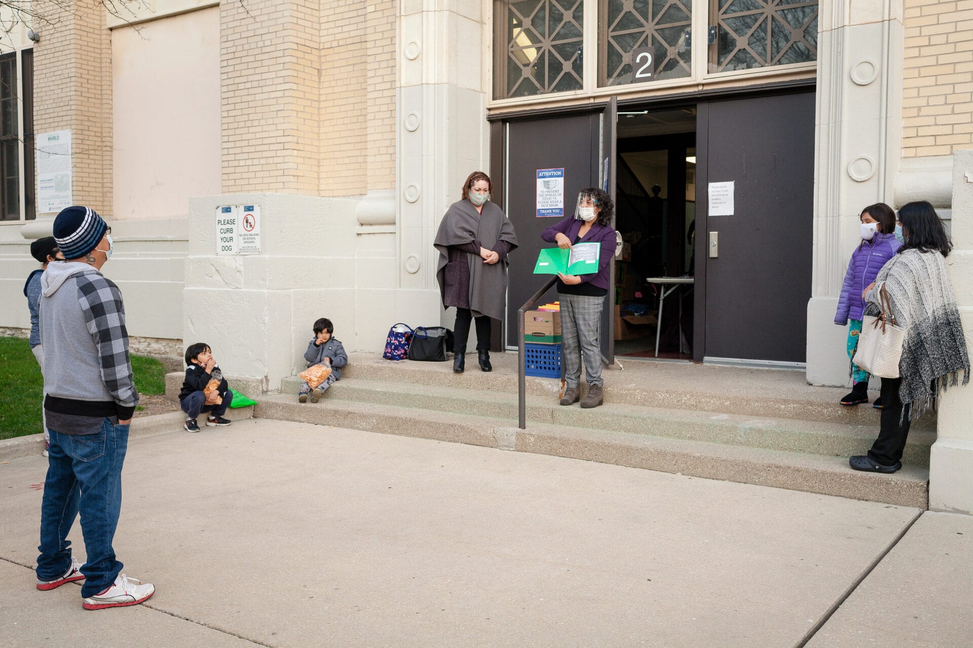 Contreras habla con los padres y estudiantes fuera de la escuela una tarde de noviembre. Ella insta a los padres a que tomen un papel activo para ayudar a sus hijos durante el aprendizaje remoto. Michelle Kanaar / WBEZ