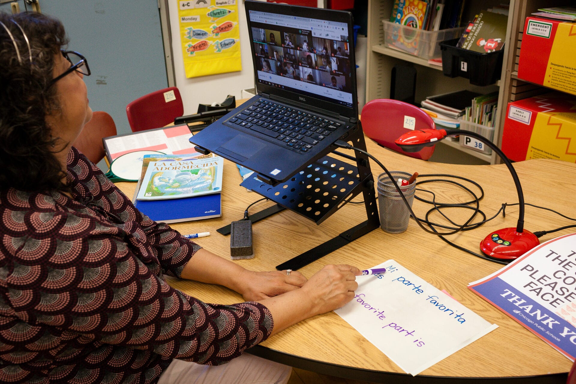 Contreras se acostumbró a enseñar de manera remota a medida que avanzaba el otoño. Ella obtuvo una cámara para documentos que le permite mostrar el trabajo de sus alumnos en tiempo real. Michelle Kanaar / WBEZ