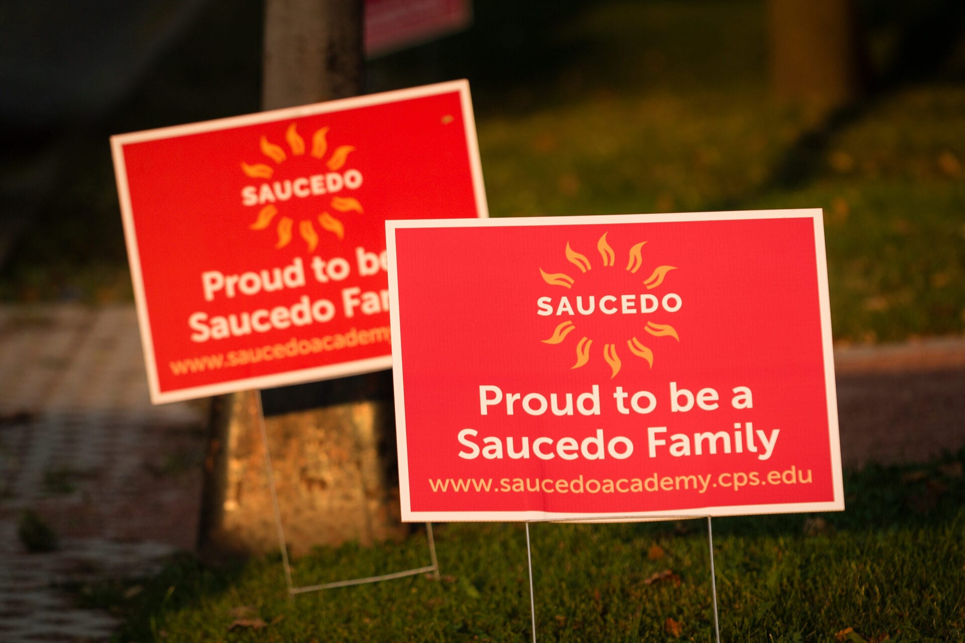 La directora de la escuela Saucedo colocó estos letreros por todo el plantel. Ella dice que aunque los estudiantes no están ahí, ella quiere que las familias sepan que ellos todavía son parte de la comunidad. Michelle Kanaar / WBEZ