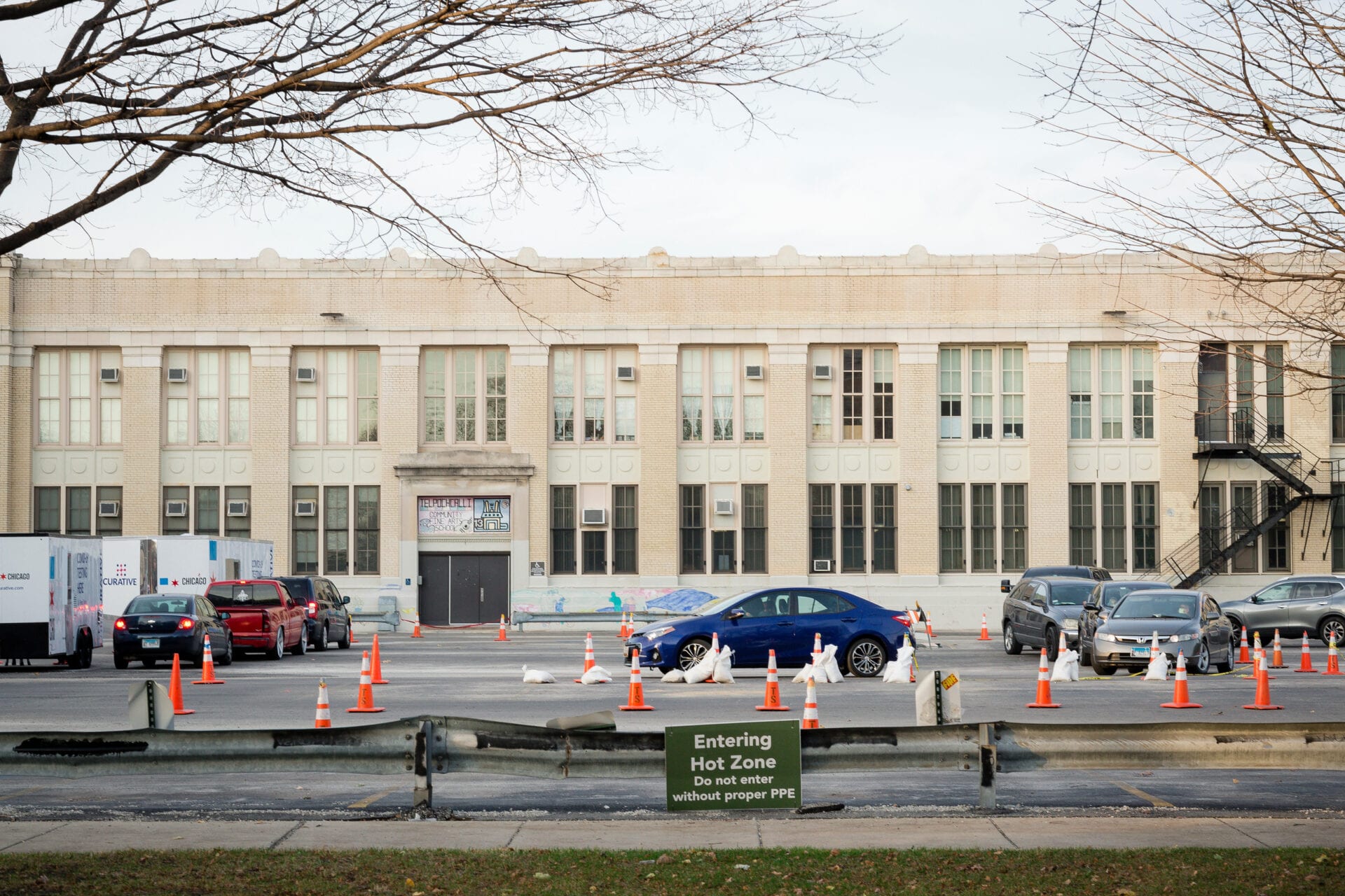 Desde mayo, el estacionamiento de la escuela Saucedo se ha transformado en un sitio de pruebas gratuitas de la ciudad. Este otoño, la fila de autos que esperaban por pruebas a menudo se extendía por cuadras. Michelle Kanaar / WBEZ