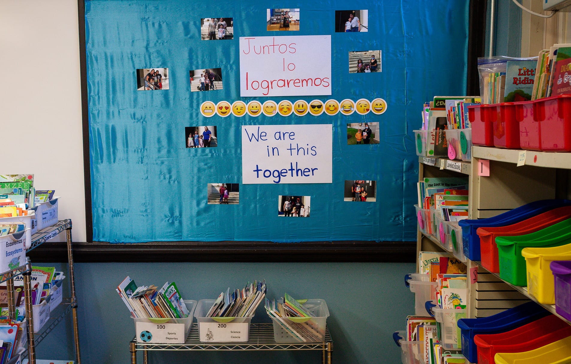 Algunas semana después, ella transformó su salón. Contreras imprimió fotos que tomó de los niños en la jornada de puertas abiertas (open house) y puso una en cada escritorio. Ella decoró los tablones de anuncios. Entonces, ella les dio a los estudiantes un recorrido virtual por el cuarto. Los niños estaban emocionados mientras señalaban sus decoraciones favoritas. Ella les dijo que el salón de clases los estaba esperando.