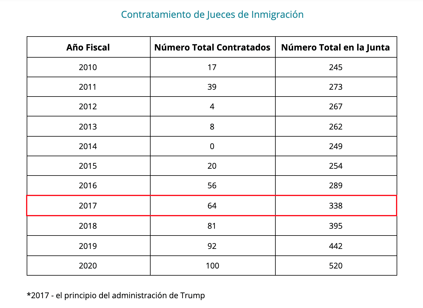 Luego de que Trump asumiera el cargo hace cuatro años; amplió drásticamente el tamaño de la magistratura de inmigración de 306 a 520 en octubre de 2020. En comparación, según el Departamento de Justicia, había un promedio de 258 jueces de inmigración trabajando en Estados Unidos en los años fiscales de 2010 a 2015.