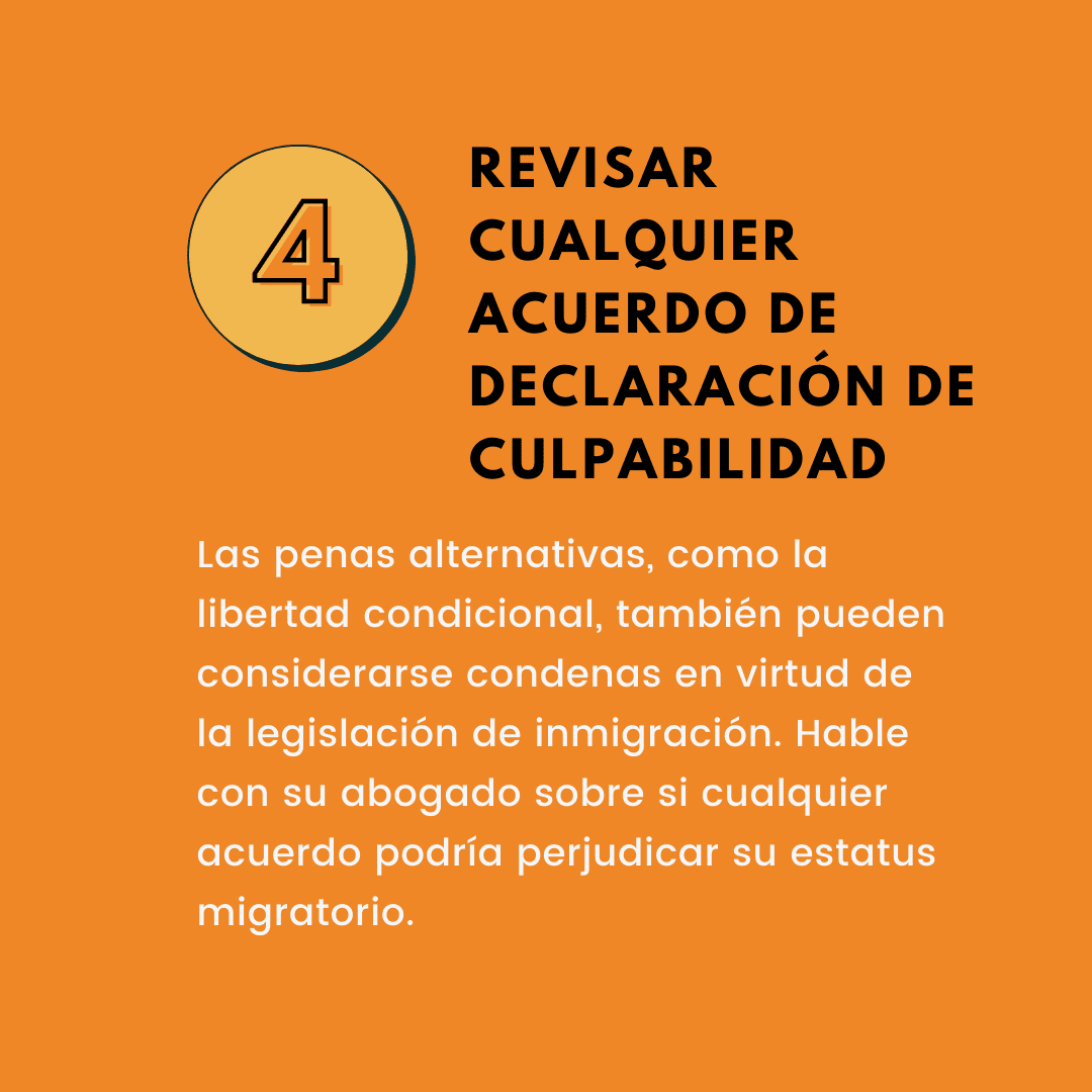 Por estas razones, anticipar las consecuencias colaterales debido a los estatus migratorios puede resultar difícil, incluso para los abogados defensores penales más informados. Sin embargo, en el caso Padilla v. Kentucky en 2010, la Corte Suprema de los EE.UU. sostuvo que, bajo la Sexta Enmienda, los abogados tienen la obligación de preguntar a los clientes sobre su estado de ciudadanía e informarles si un acuerdo de declaración de culpabilidad conlleva un riesgo de deportación.