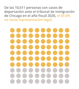 Si bien la Sexta Enmienda garantiza a los acusados un derecho a un abogado, ese mismo derecho no se extiende a los tribunales de inmigración. El año pasado, el 66% de los inmigrantes en procedimientos de deportación a nivel nacional no tenían abogado, según el Transactional Records Access Clearinghouse de la Universidad de Syracuse. En el Tribunal de Inmigración de Chicago, esa cifra estaba más cerca del 70%.