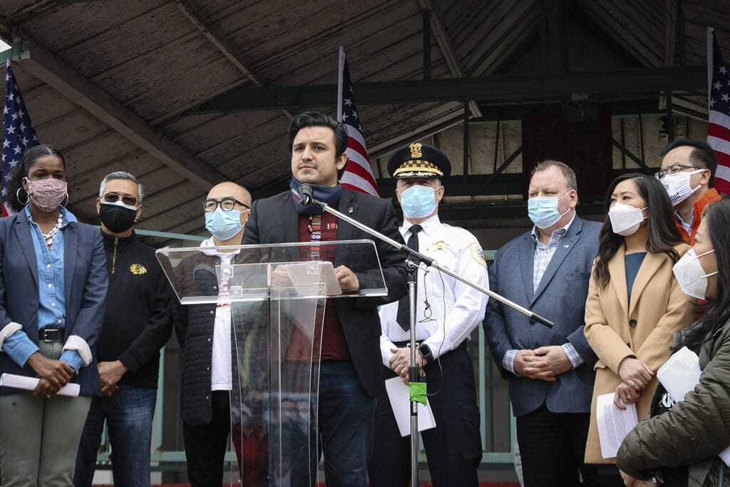 Ald. Byron Sigcho López, concejal del Distrito 25, habla en la manifestación que se celebró en solidaridad con la comunidad asiática-estadounidense en el Barrio chino Square en marzo. Diane Bou Khalil/Borderless Magazine