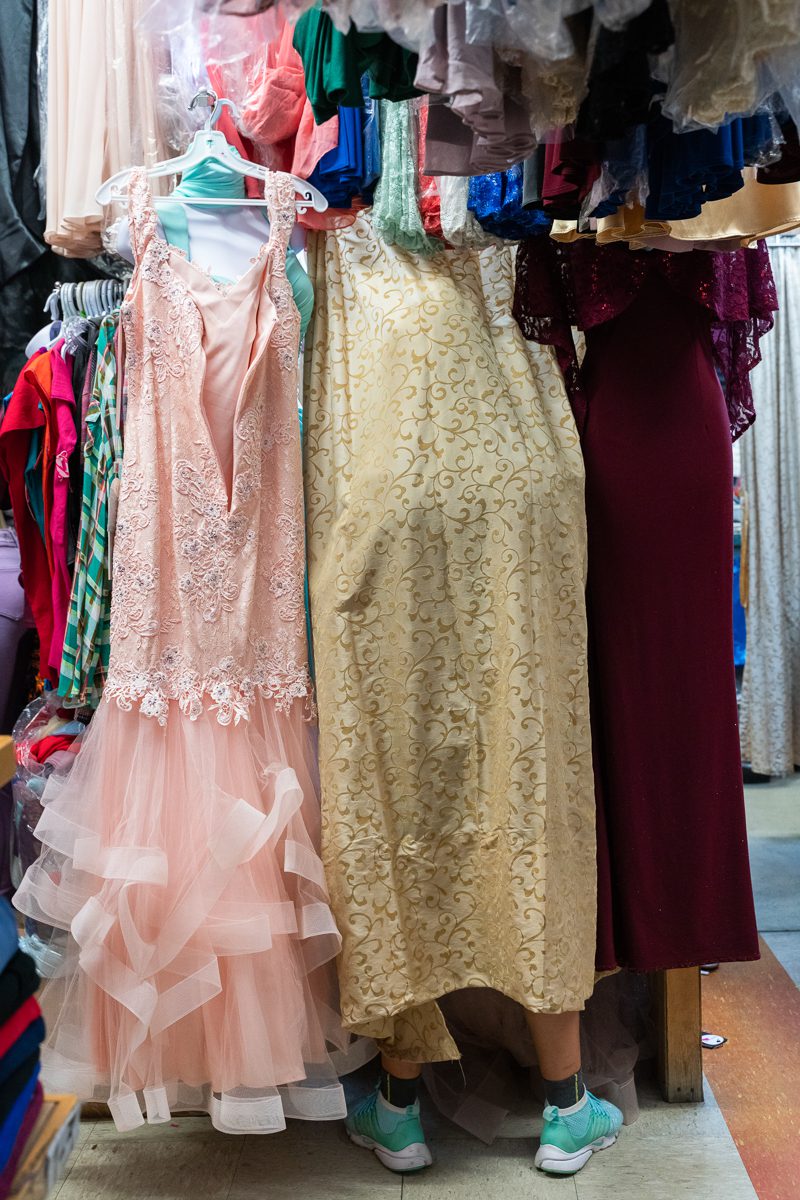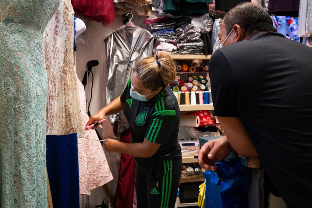 Como muchos dueños de negocios, Kocoy Malagón es un experto en múltiples tareas. En un día de trabajo típico en Discount Mall, Malagón se puede encontrar sentado en una máquina de coser zumbante debajo de un dosel de vestidos colgantes, trabajando ágilmente para recortar hilos, ajustar telas delicadas y administrar su escaparate.