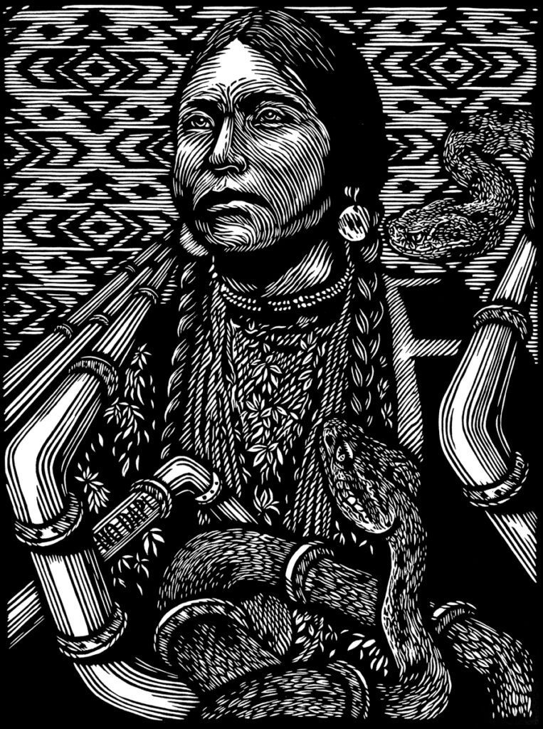 The Nicaragua-born, Chicago-based artist creates intricately carved, monochromatic linocut prints that often depict the issues and experiences of migrants from Latin and Central America, such as their perilous journeys to the U.S. His dramatic works often feature drawings of Black and Brown people who are part of movements for justice, from George Floyd to an Indigenous woman protesting the Dakota Access Pipeline, depicted with the pipeline snaking around her torso. Though sometimes somber in tone, Barberena’s prints also use satire to invite societal critiques. At other times, he hopes to show the humanity of migrants and how everyone deserves a safe and healthy life.