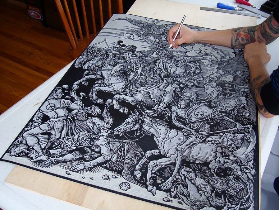Mi forma de trabajar es que empiezo con una idea y una imagen de referencia, como una fotografía, y dibujo sobre un trozo de linóleo o madera, haciendo mi propio diseño. Luego corto alrededor de esas líneas. Con el grabado, debido a que tiene múltiples copias, puede llegar a más personas. La gente siempre dice que es una técnica más democrática, y lo es, porque esa pieza podría estar en un museo, en una galería, en las calles, en una camiseta al mismo tiempo. Esa es la parte maravillosa del grabado.
