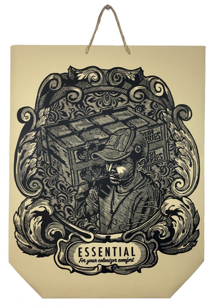 Mi serie “Essential: For your colonizer comfort” (esencial: para la comodidad de su colonizador), que se exhibe, honra a los trabajadores agrícolas, la mayoría de los cuales son indocumentados, y crea conciencia sobre por qué son “trabajadores esenciales”. La población estadounidense y el gobierno federal los etiquetaron como “esenciales” en el contexto de COVID, un supuesto honor por su centralidad en el sistema alimentario, mientras que hacen poco para aliviar su falta de derechos básicos y vulnerabilidad a la explotación y la deportación inminente.