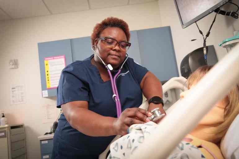 A nursing student works in a simulation lab at Milwaukee Area Technical College. Health care careers such as certified nursing assistant are among the top jobs of MATC graduates.
