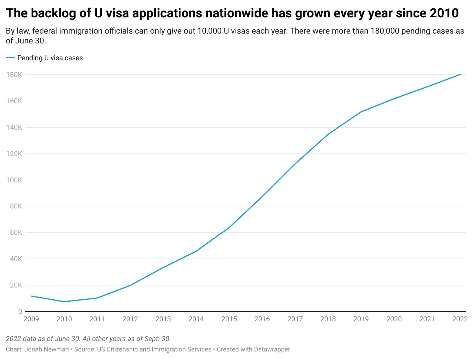 By law, federal immigration officials can only give out 10,000 U visas to crime victims each year. USCIS said it has more than 180,000 pending cases, double the number in 2016. Between October 2021 and June 2022, the number of pending cases grew by more than 9,000, or about 34 a day.