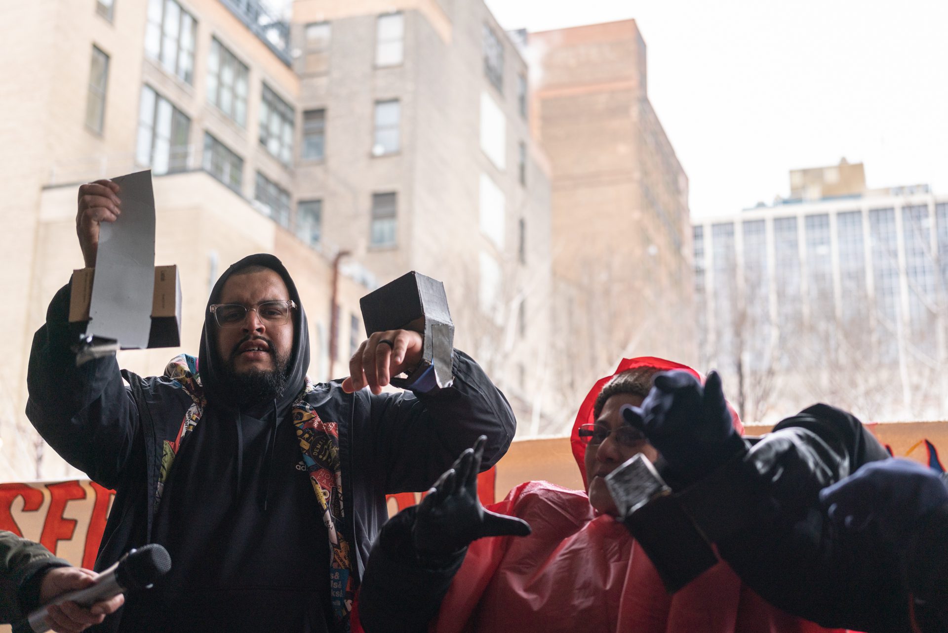 Members of Colectivo Huehuecoyotl, a group of Aztec ritual performers, cleansed the space around Chicago’s Federal Plaza midday Saturday, greeting mother earth and calling for the end of injustices against immigrants. The “prayer in movement” was a reminder for the 40 or so protesters gathered in the falling snow in downtown Chicago that they were standing on indigenous land and U.S. citizenship is a settler-colonial concept.