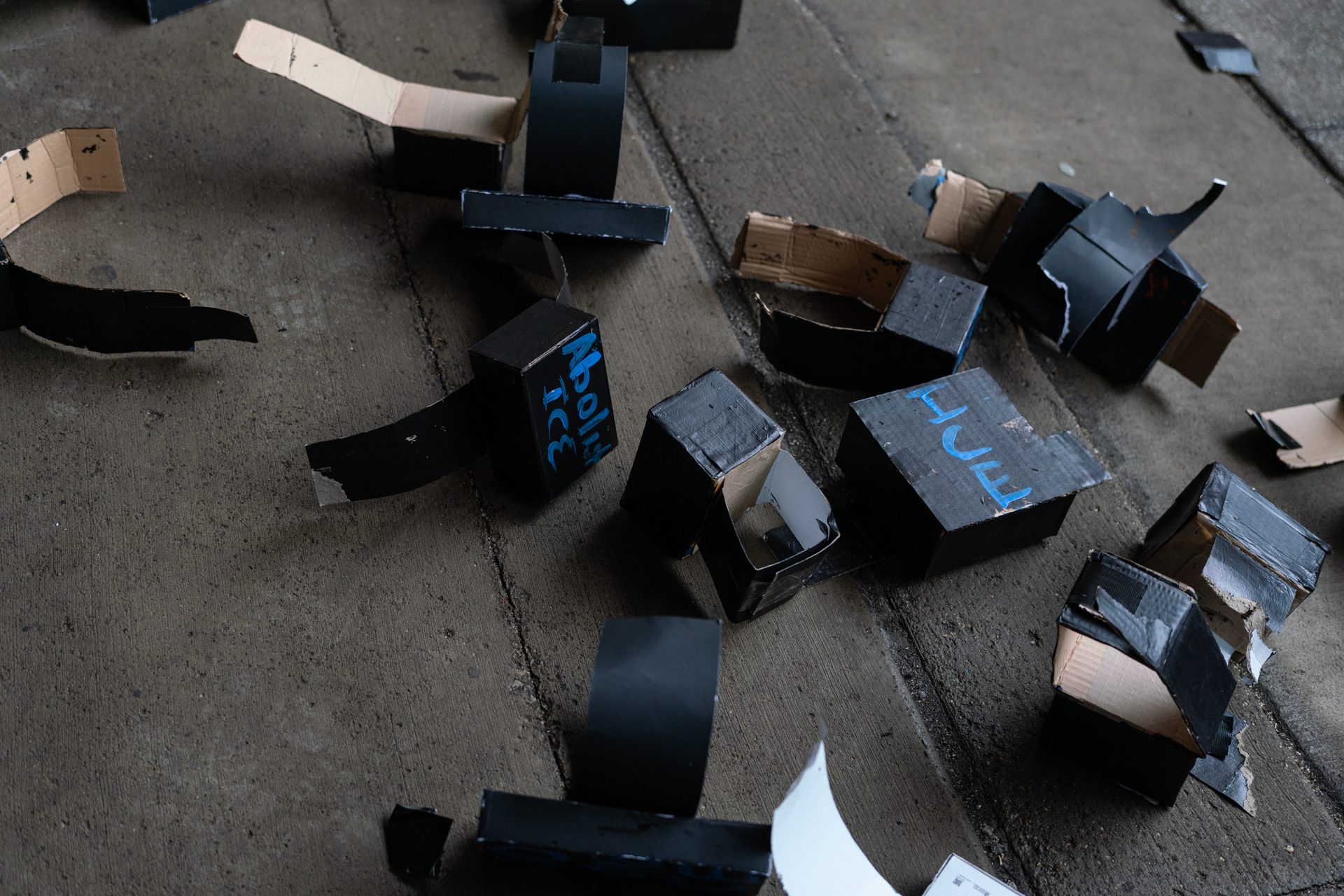 With CPD officers looking on from the near sidewalk, protestors symbolically ripped off their cardboard ankle monitors and threw them on the ground.