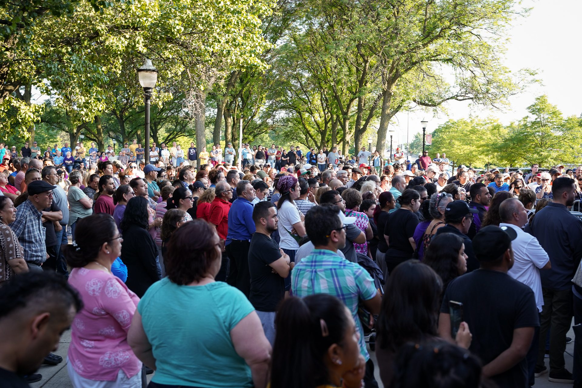 Nearly 300 Cicero residents gather outside the front doors of Morton College to listen to an at-capacity public meeting on flooding with representatives from the town of Cicero and the Metropolitan Water Reclamation District in Cicero, Ill., July 18, 2023. After two hours, the crowd began to disperse as it became evident that they would not receive clarity on the assistance that the local and federal governments would provide. Efrain Soriano/Borderless Magazine