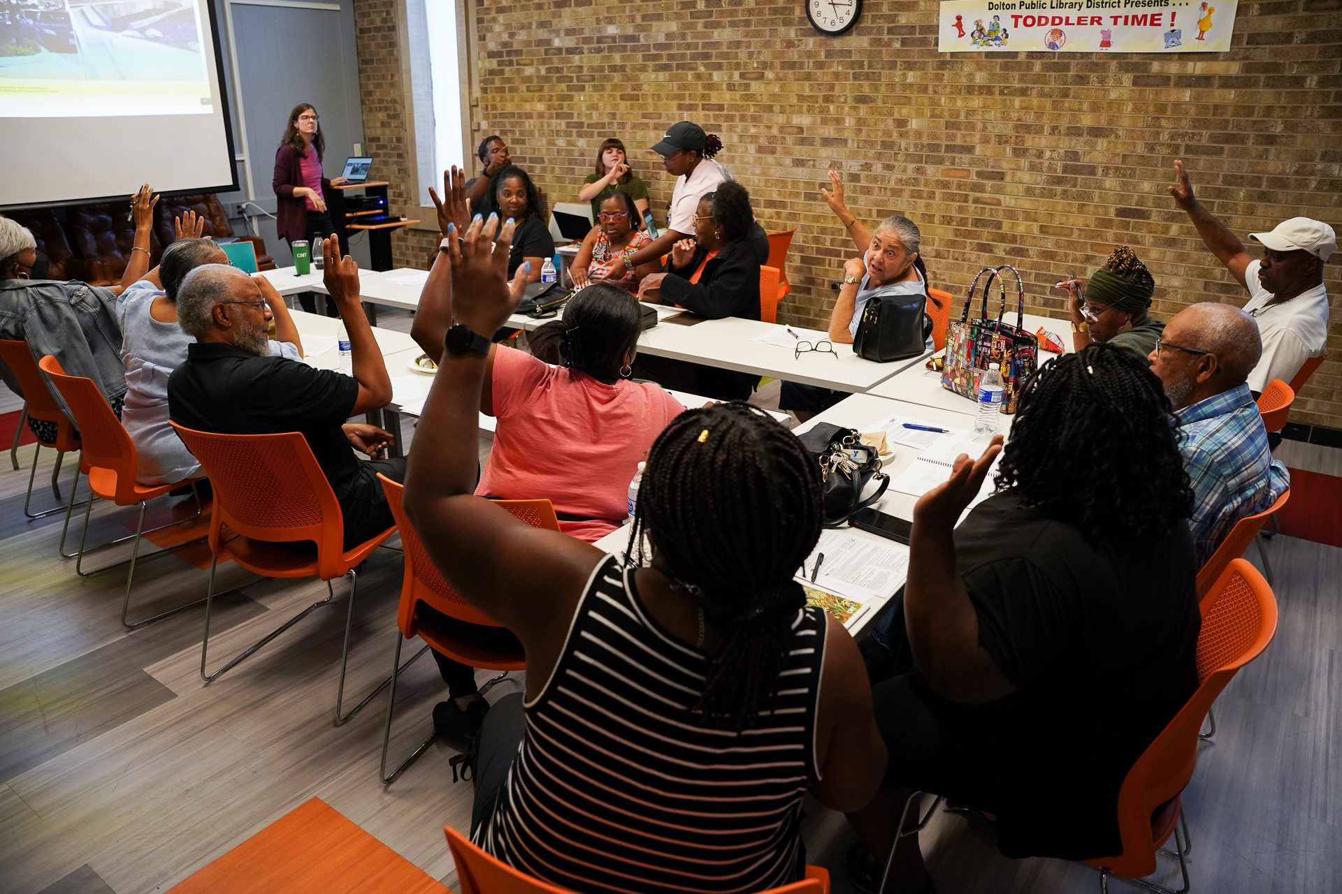 Fourteen Dolton residents raise their hands to vote on various flood mitigation projects proposed by the Center for Neighborhood Technology as part of the first RainReady steering committee meeting in Dolton, Ill., Aug. 3, 2023. The committee ultimately voted to prioritize projects that would directly aid residential areas with personal rain gardens and grants for homeowners dealing with flooding damage. Efrain Soriano/Borderless Magazine