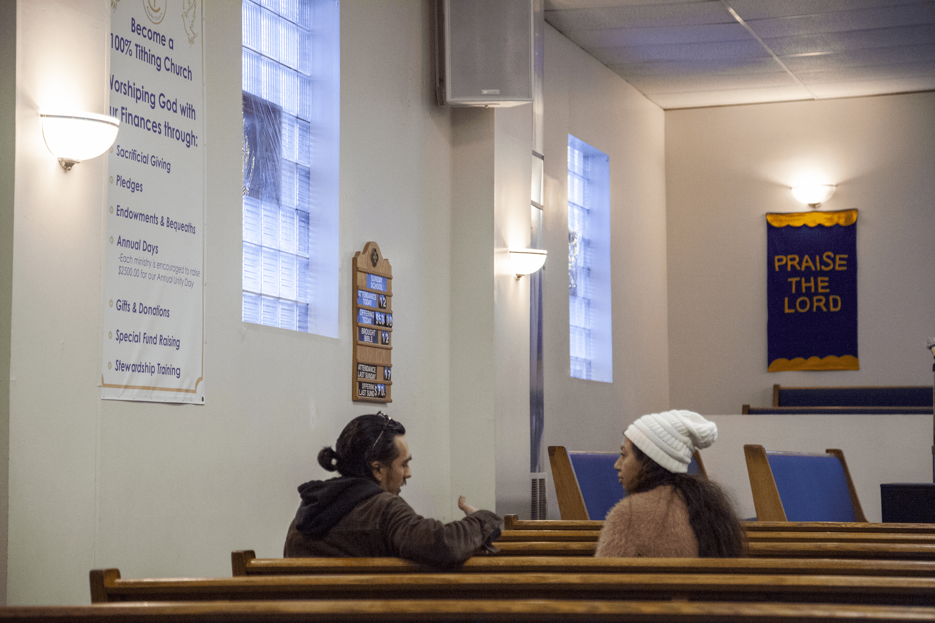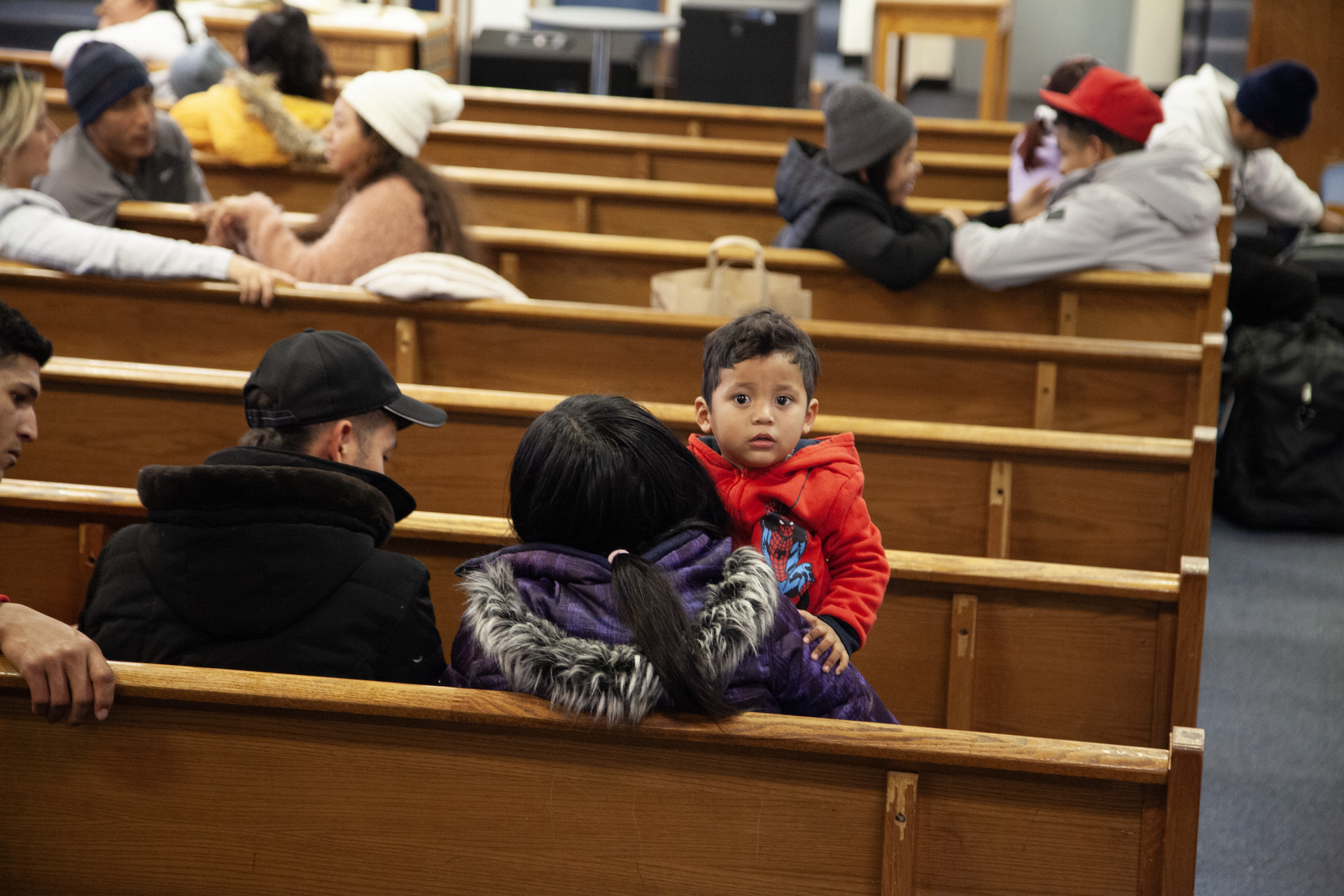 At Concord Missionary Baptist Church in early February, asylum-seekers gather in the large sanctuary for the church’s first Spanish-speaking Sunday service. The pews are bright blue and brown, and almost half are filled with first-timers who are staying at the nearby city-run shelter inside the University of Chicago Charter School on 63rd Street. After the service, many stayed to receive luggage and winter clothing from Concord’s makeshift free store.
