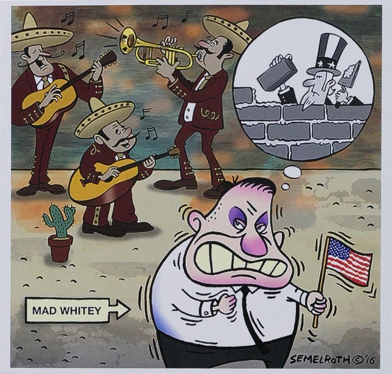 “It feels like reason has sort of flown the coop,” says artist Eric Semelroth. “The people on the right talk about generalities and making America great again. But what does that even mean? Maybe people who support Trump’s immigration policies haven’t seen the economic impact of immigrants in this country, the good they do and the businesses they start. Maybe once they see the good in that they might soften their immigration positions, but I can’t think the way they do. I just have to keep on doing what I do with my art to foster a discussion. I don’t know if it’s going to persuade anybody, but I’ve got to say what I’ve got to say.”