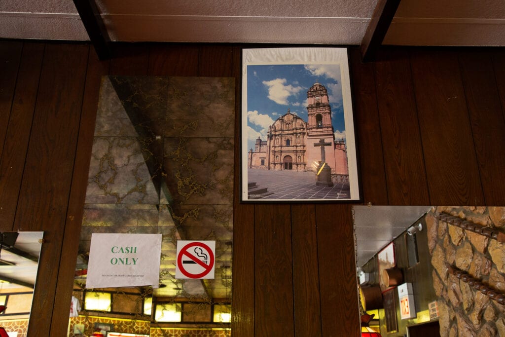 From left: A Cash Only sign and No Smoking sign hang alongside a poster of Santuario de Nuestra Señora del Carmen, a church in the town of Tlalpujahua. Several posters of churches in Michoacán, from Hugo Espino’s trips to his home state, decorate the walls at Golden House. Photo: Woojae Julia Song for Block Club Chicago/CatchLight Local Chicago
