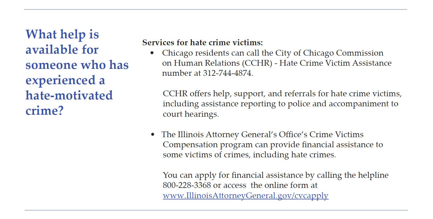 Additionally, it is not always clear how to report hate crimes and what recourse a victim has. The Chicago Police Department has an online reporting system, but because hate crime is not listed as an incident type, a hate-crime victim cannot report their case online. Instead, they must go to one of the department’s 24 police districts or call the non-emergency hotline 311 while simultaneously requesting language assistance if needed and available. CPD did not respond to Borderless’ questions about hate crime reporting.