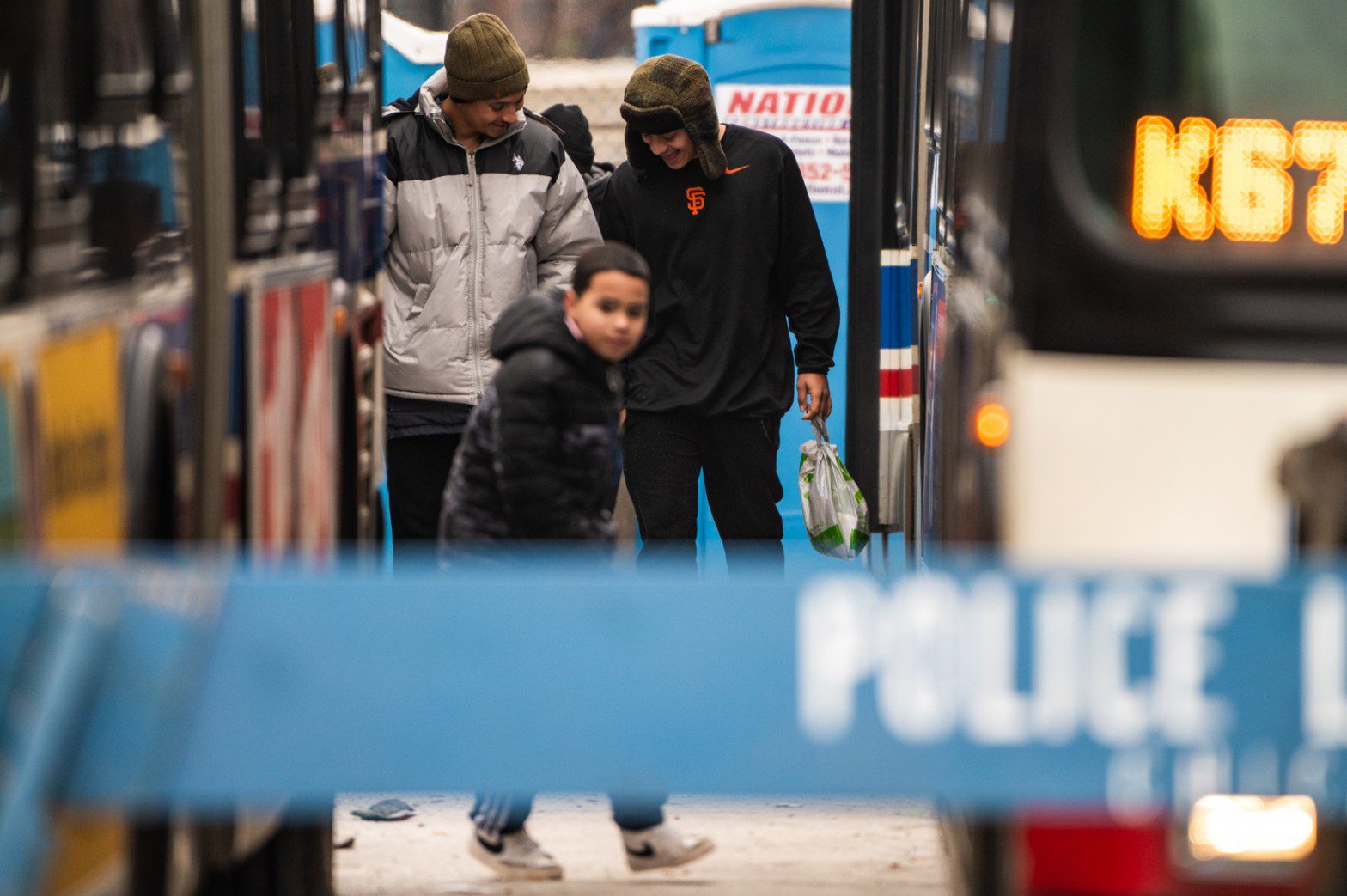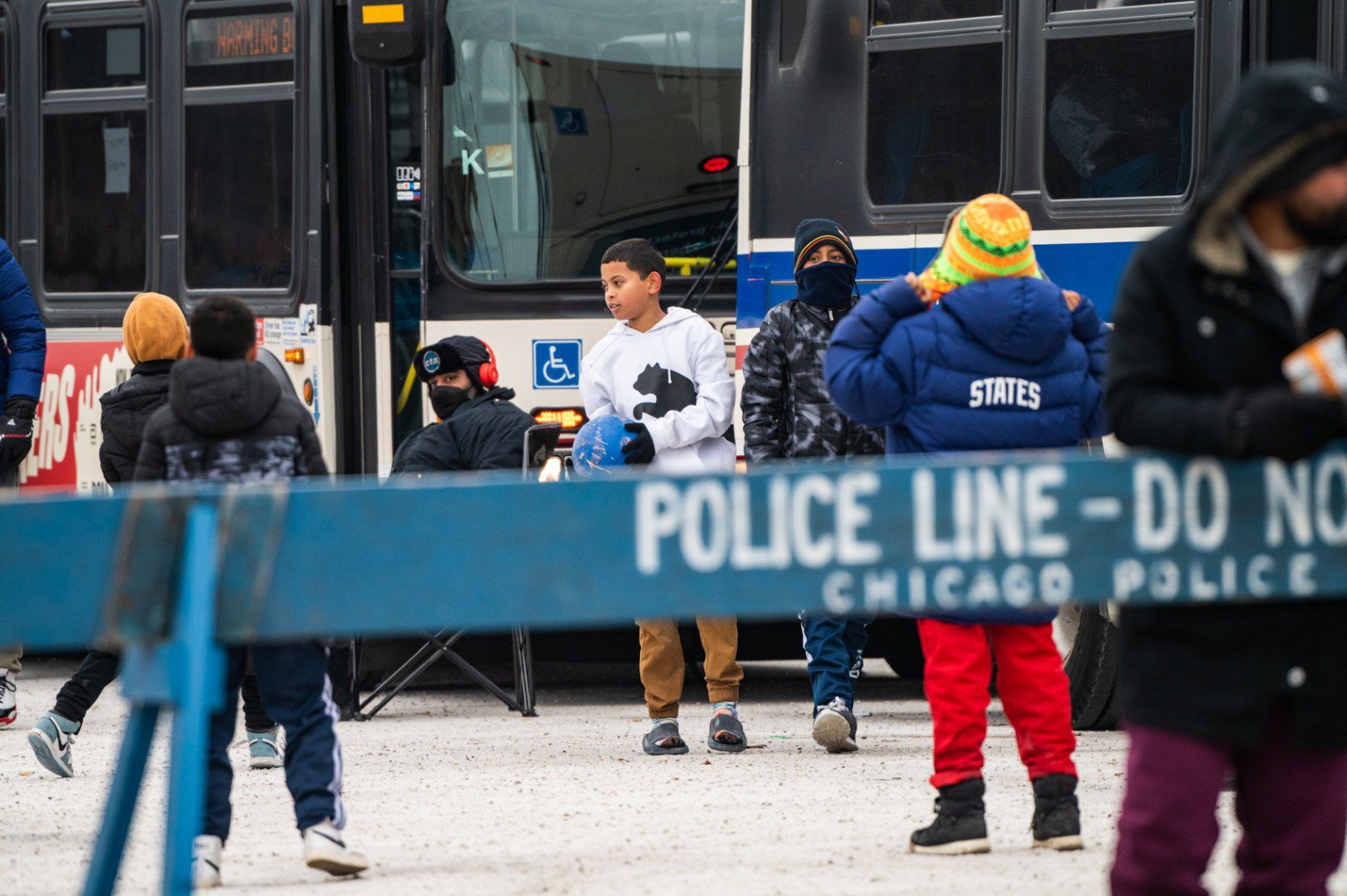 As of Monday morning, 537 asylum seekers were at the landing zone at Desplaines and Polk streets, waiting to be placed at shelters, according to data from the city’s Office of Emergency Management and Communications. Dozens of people were walking around the area Monday, some throwing around a football for the first time. Many people were seen huddled inside CTA buses labeled “warming bus.”