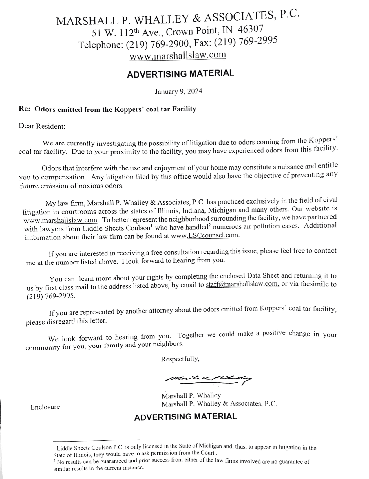 A personal-injury law firm in Indiana, Marshall P. Whalley and Associates, began distributing letters to residents in Cicero, offering a free consultation with the firm to potentially pursue a class-action lawsuit against Koppers, with another law firm that specializes in environmental litigation.